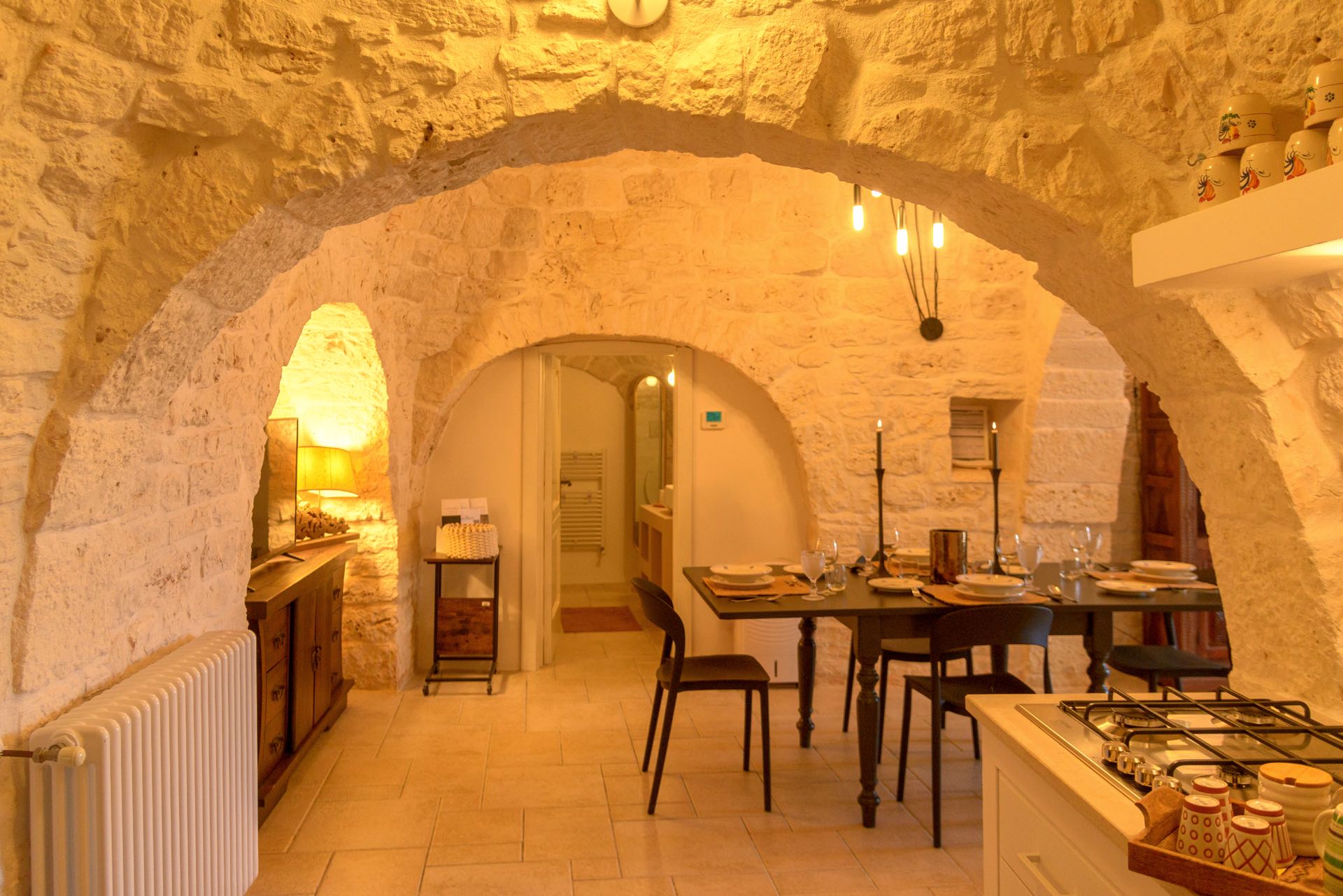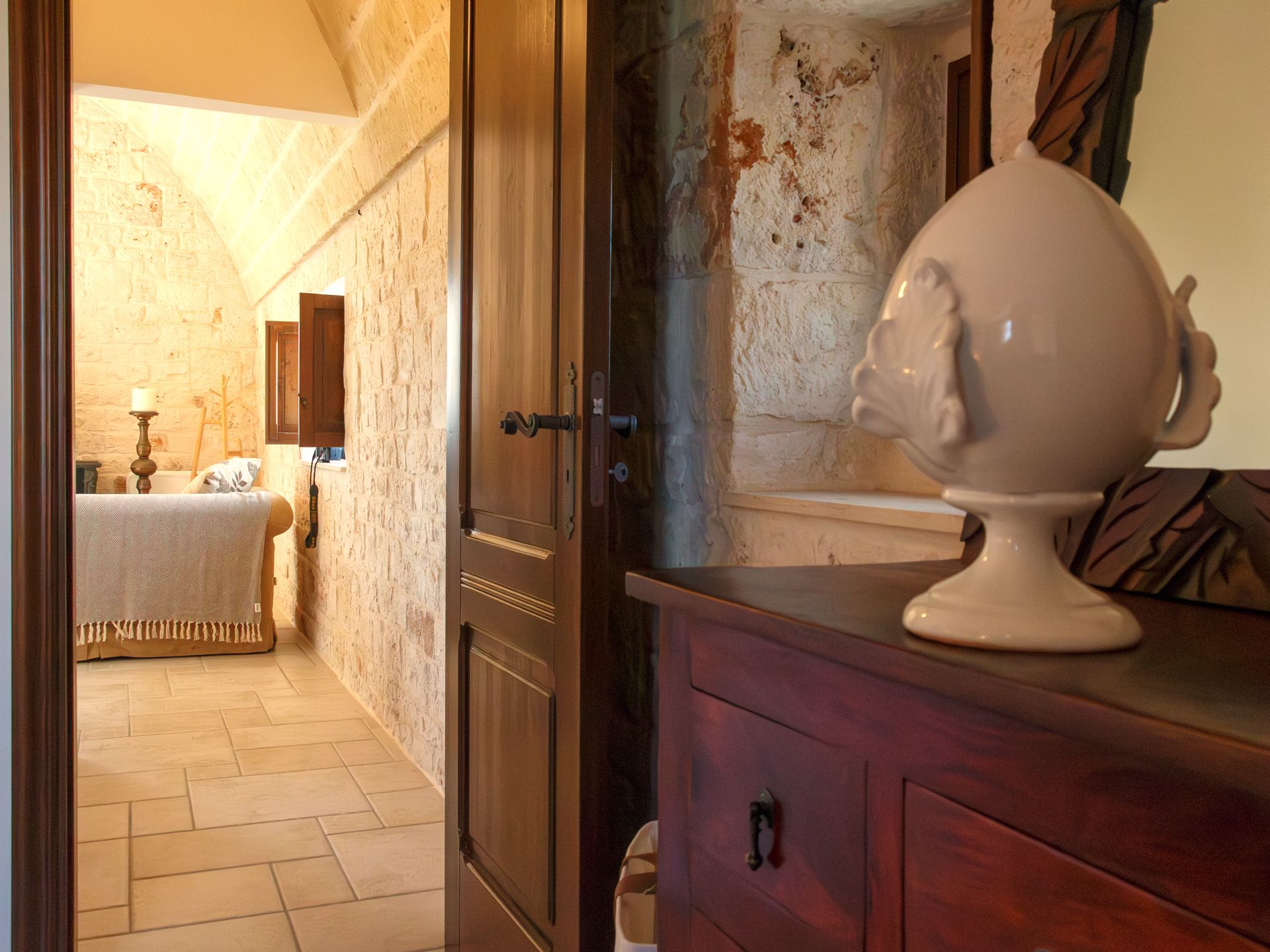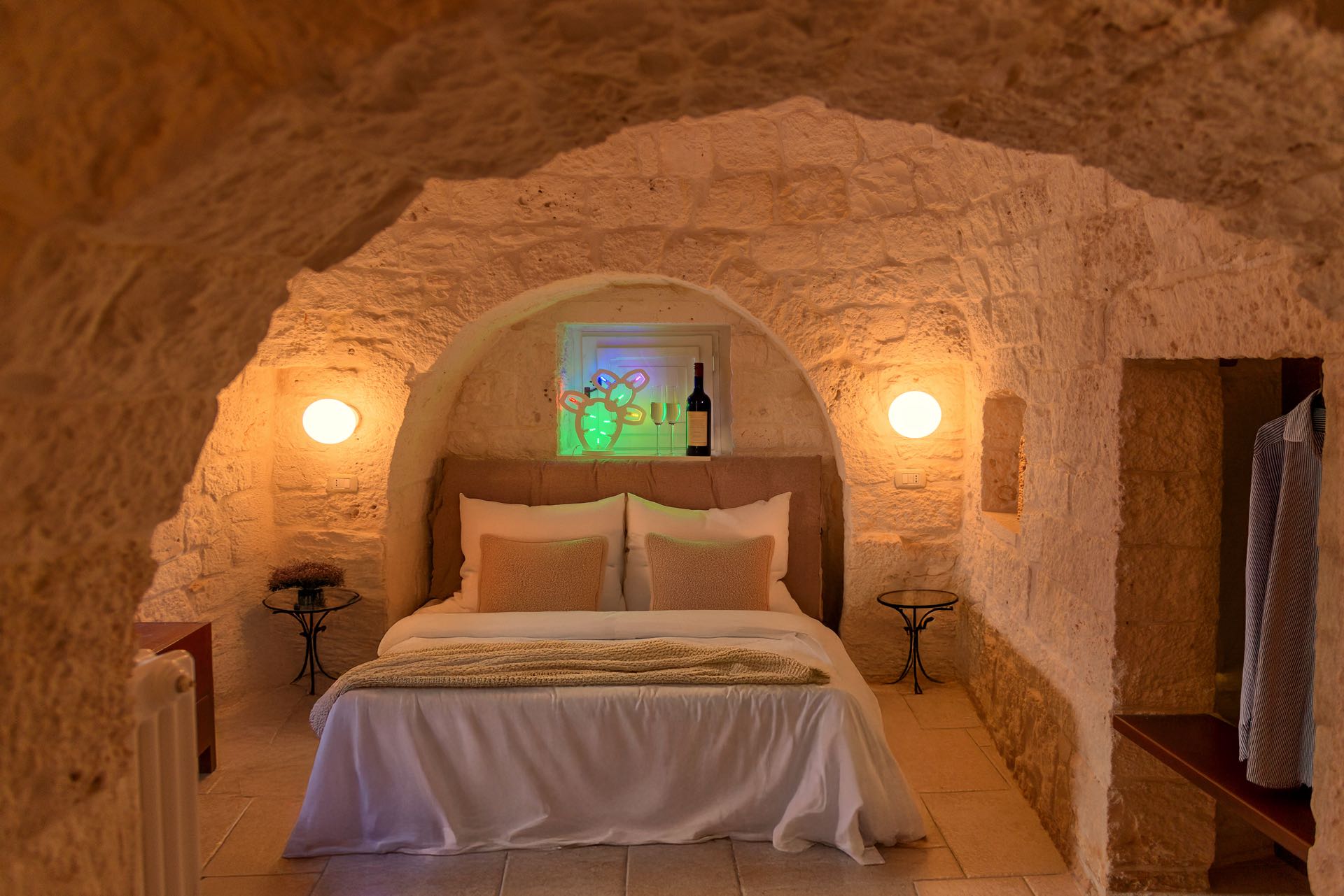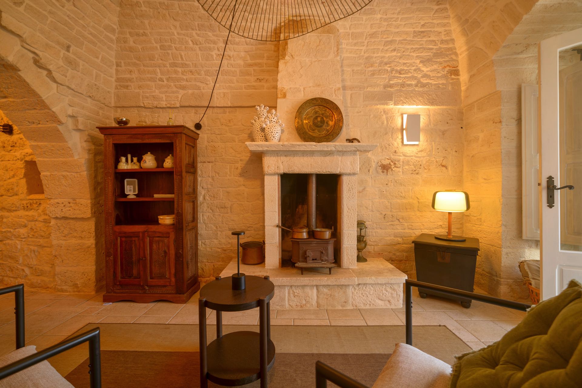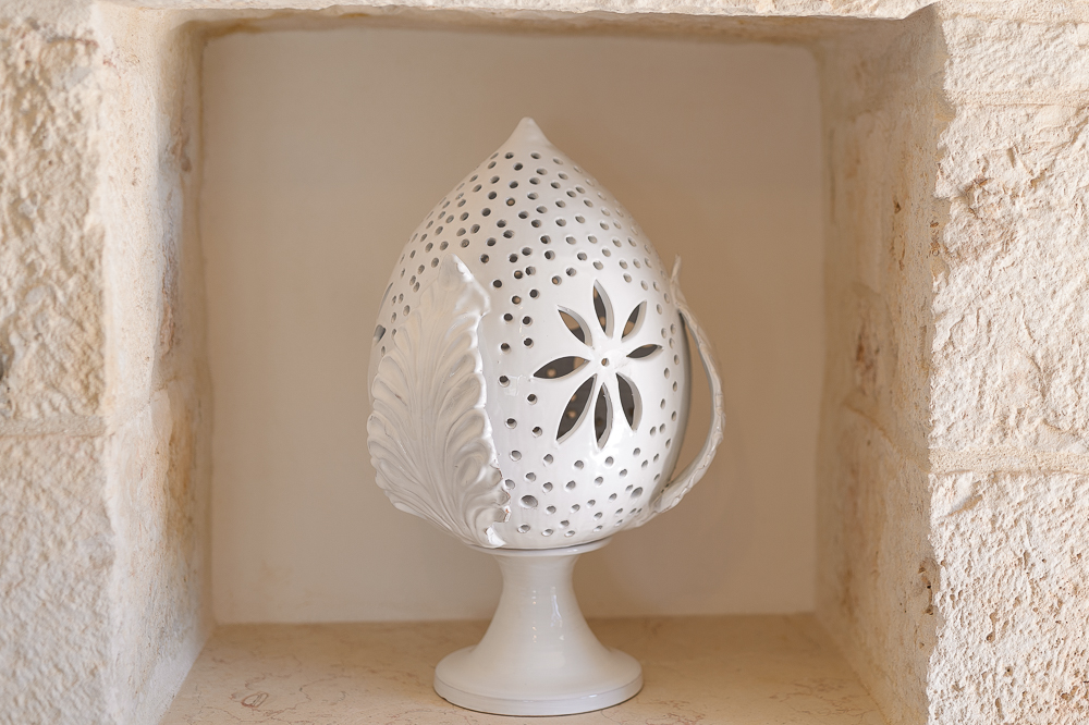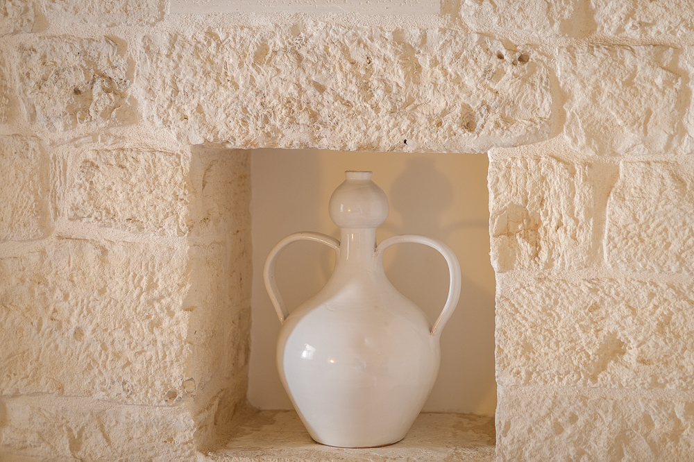 La sensazione di tornare indietro nel tempo grazie ad oggetti della tradizione e l’accoglienza del cono pugliese con luci soffuse nelle nicchie, rendono questa dimora un luogo unico. Eleganti soffitti con volte a botte, archi, nicchie e pietra originale dalle meravigliose sfumature di bianco e rosa.