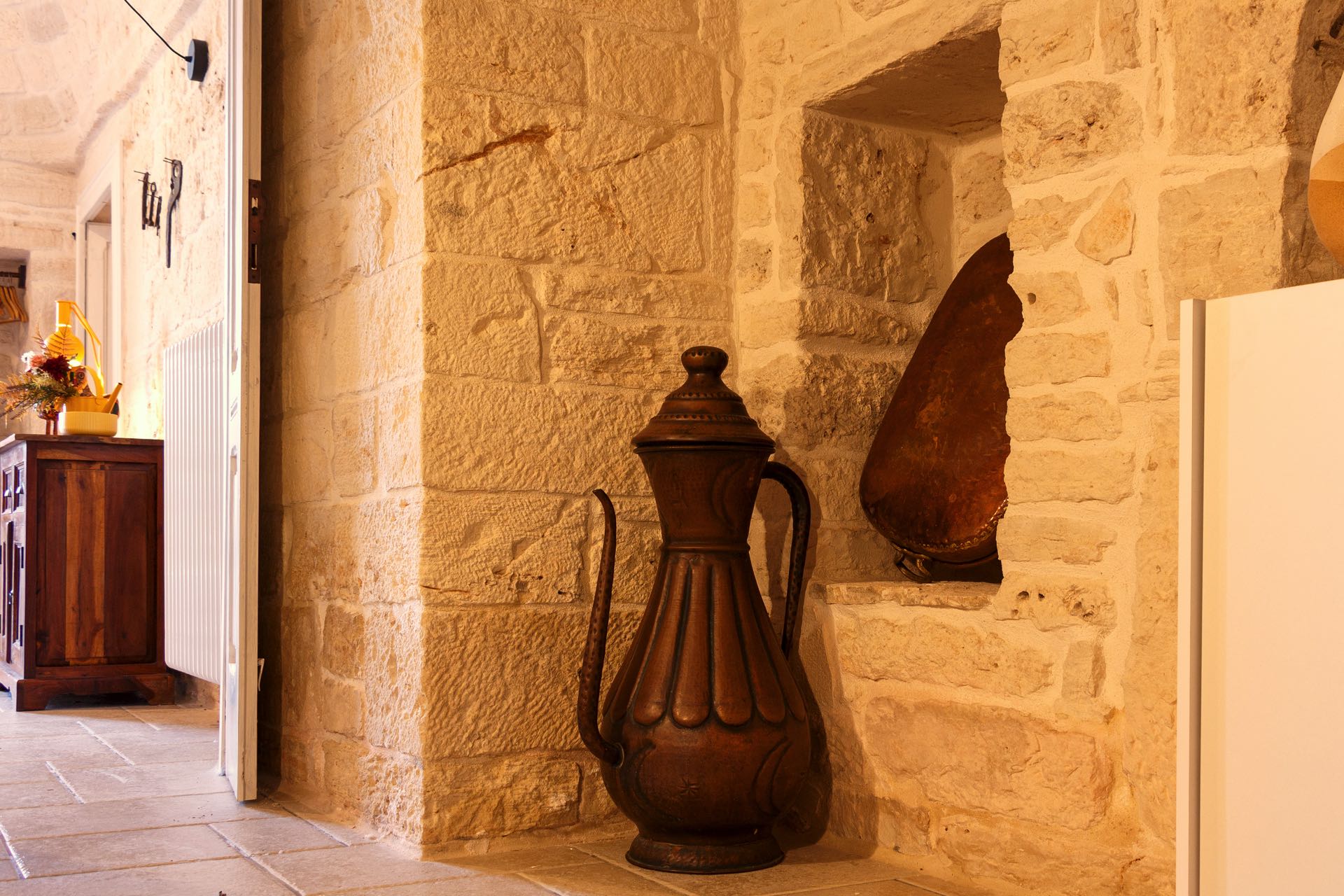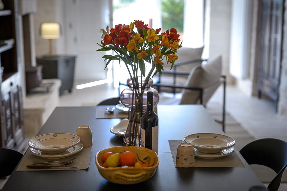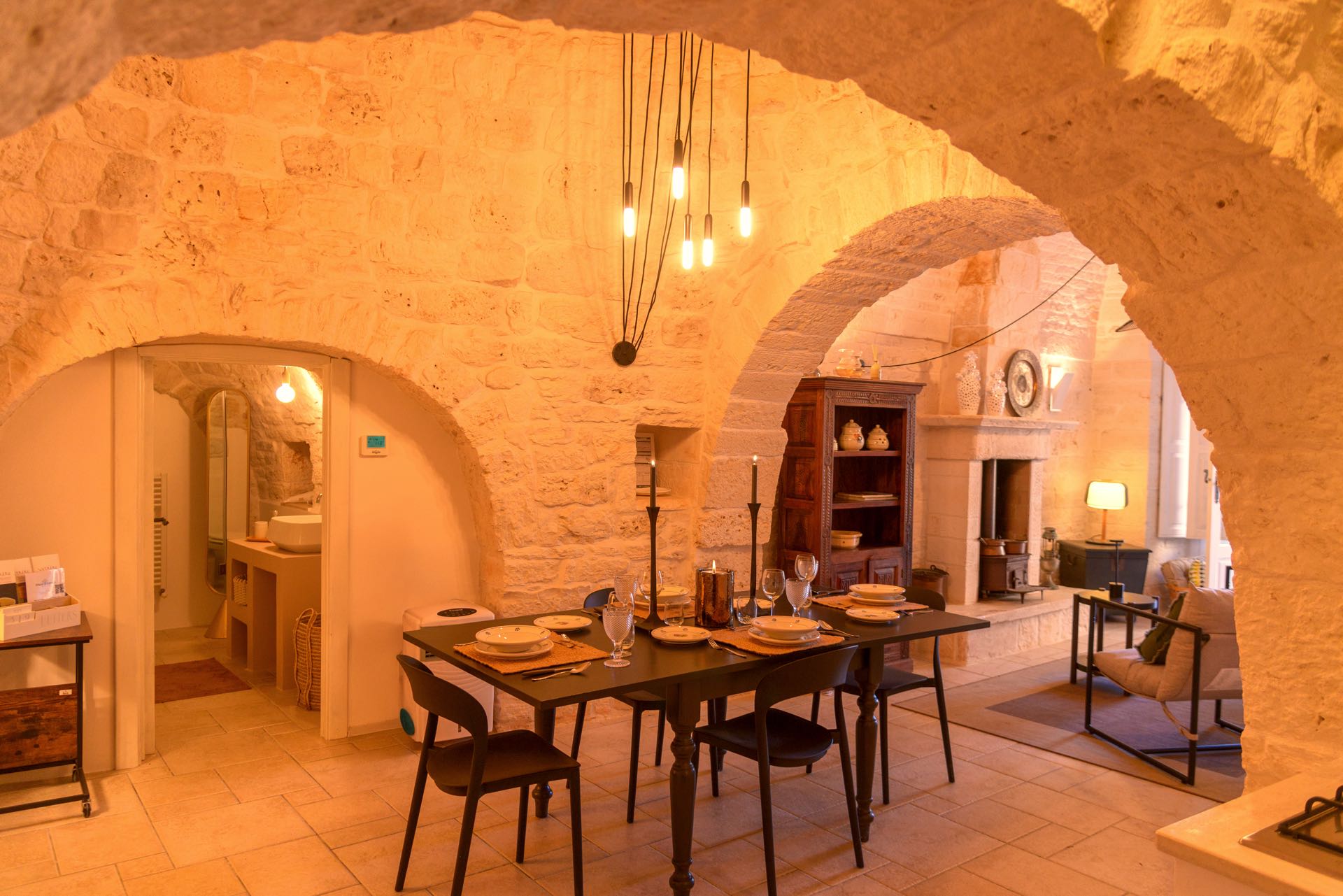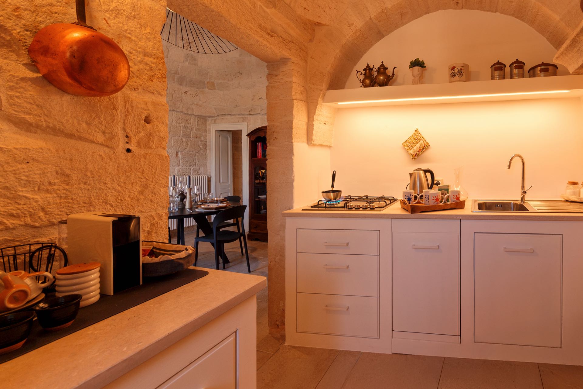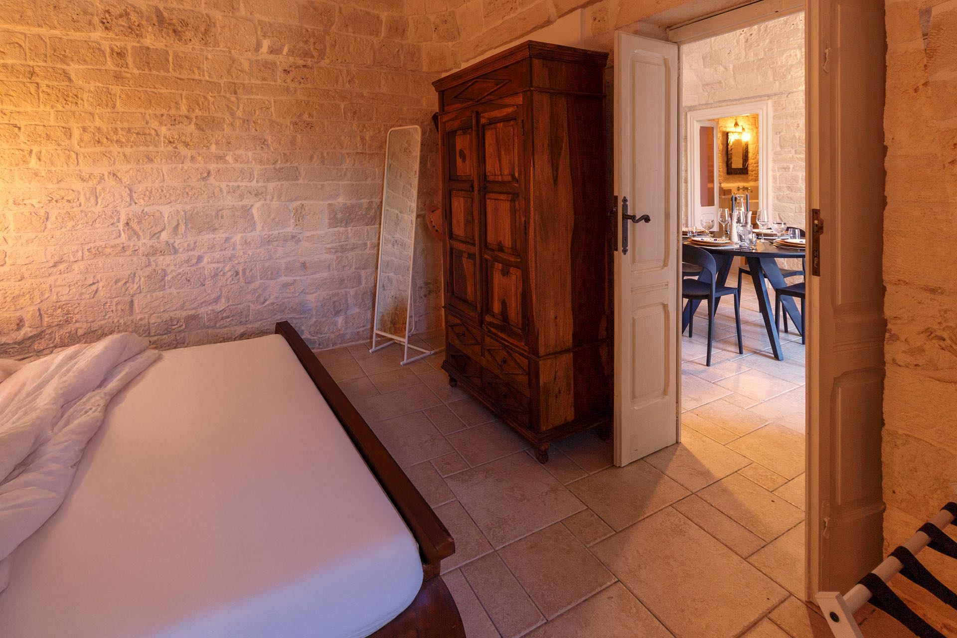 La sensazione di tornare indietro nel tempo grazie ad oggetti della tradizione e l’accoglienza del cono pugliese con luci soffuse nelle nicchie, rendono questa dimora un luogo unico. Eleganti soffitti con volte a botte, archi, nicchie e pietra originale dalle meravigliose sfumature di bianco e rosa.