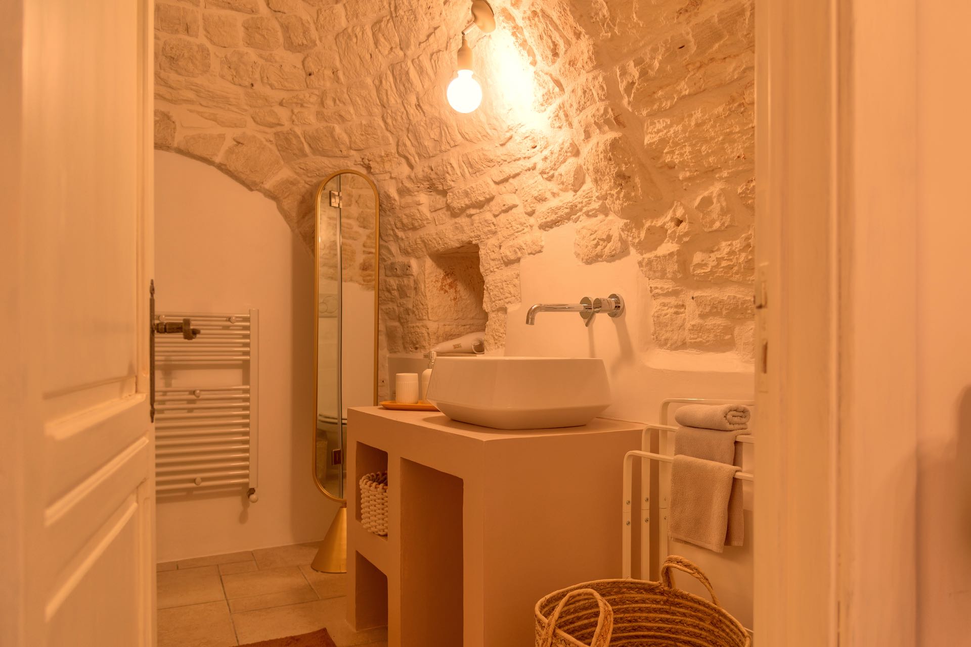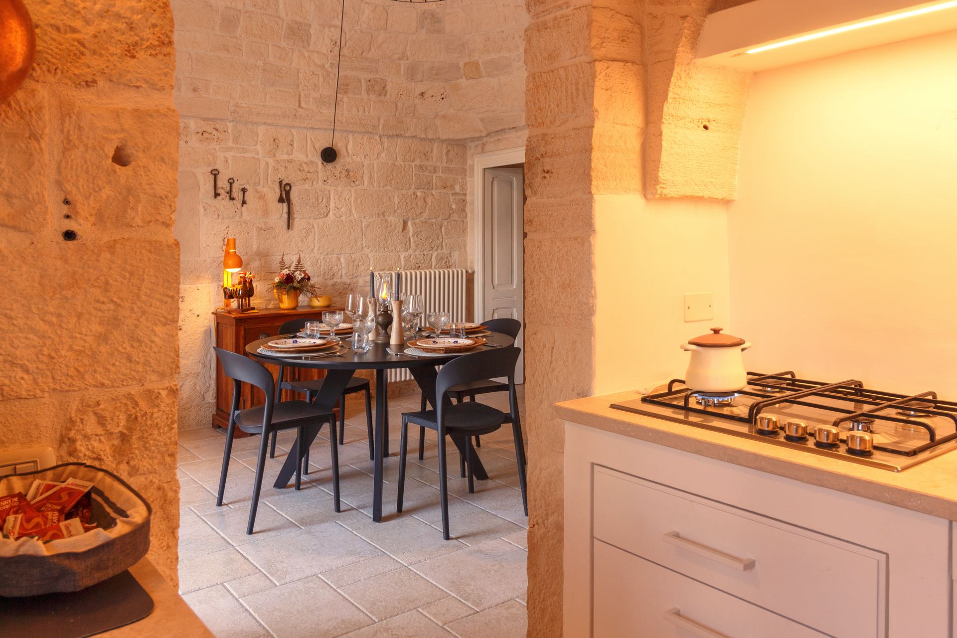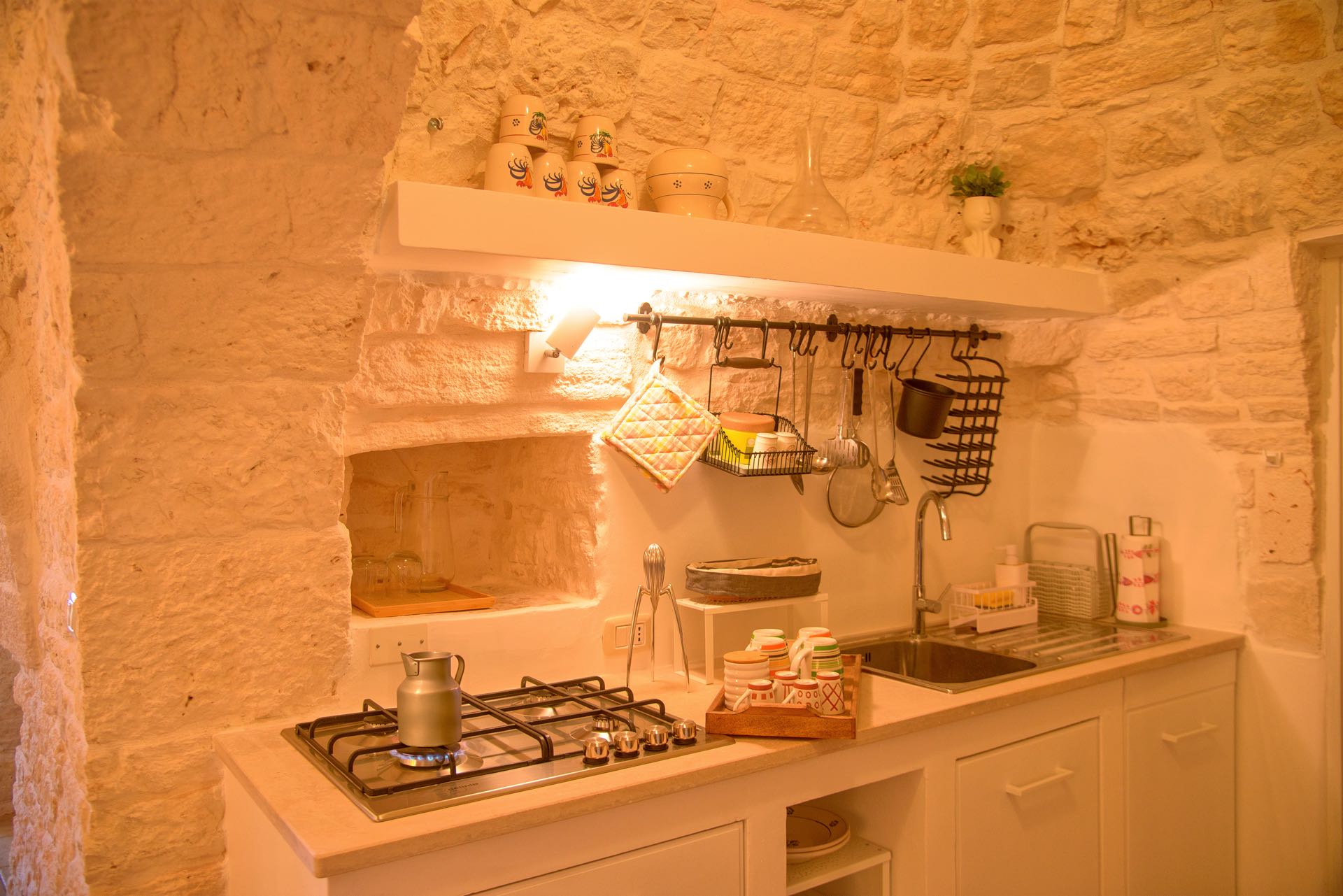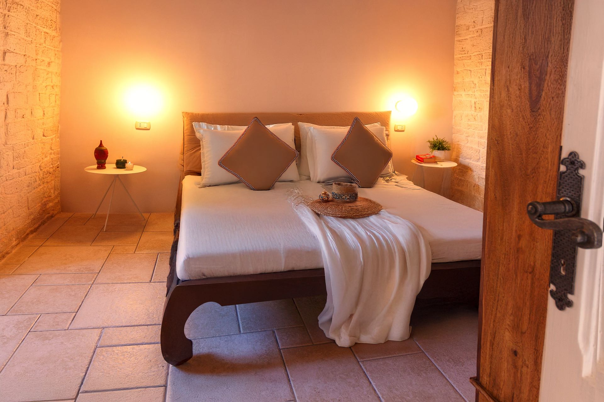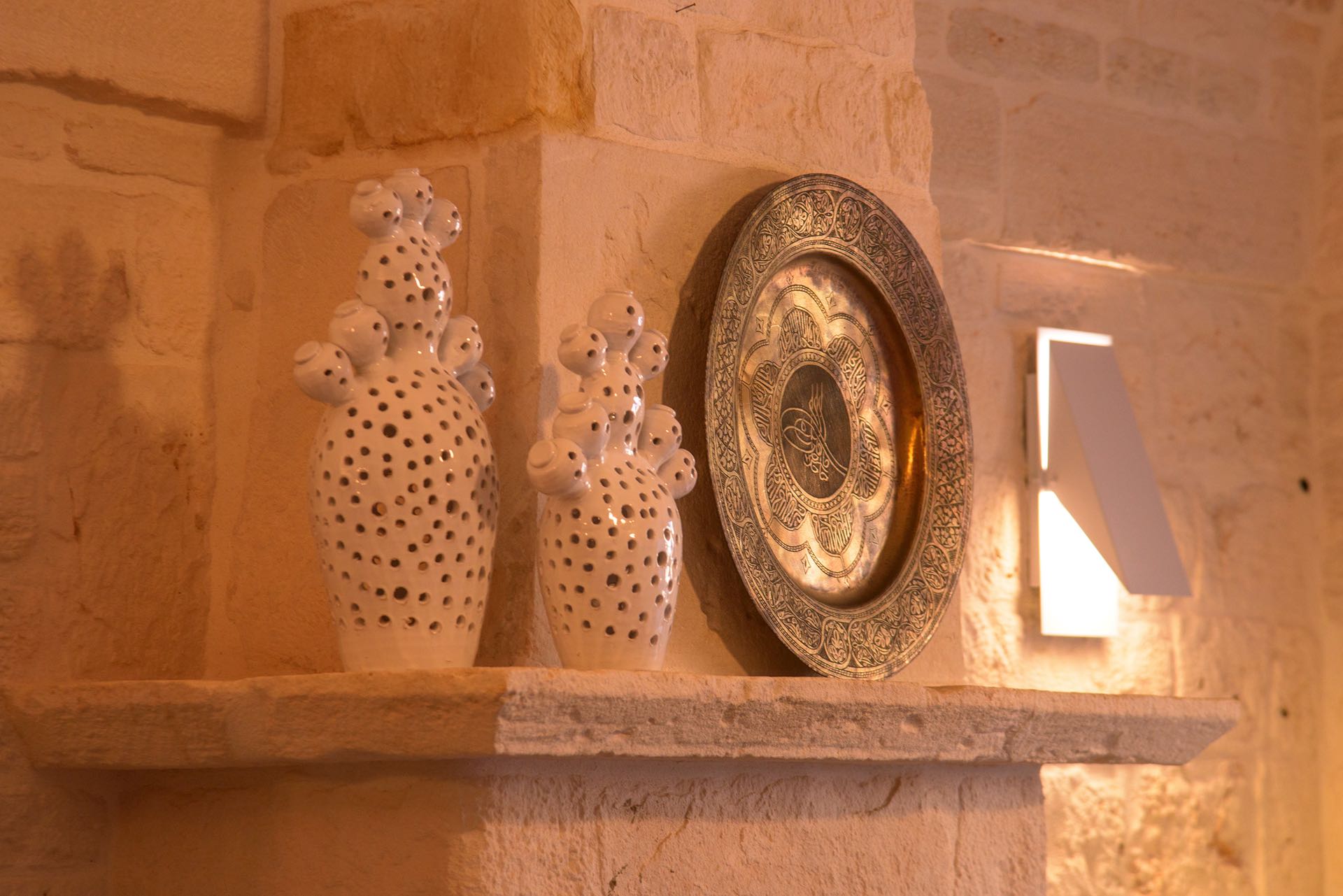 La sensazione di tornare indietro nel tempo grazie ad oggetti della tradizione e l’accoglienza del cono pugliese con luci soffuse nelle nicchie, rendono questa dimora un luogo unico. Eleganti soffitti con volte a botte, archi, nicchie e pietra originale dalle meravigliose sfumature di bianco e rosa.