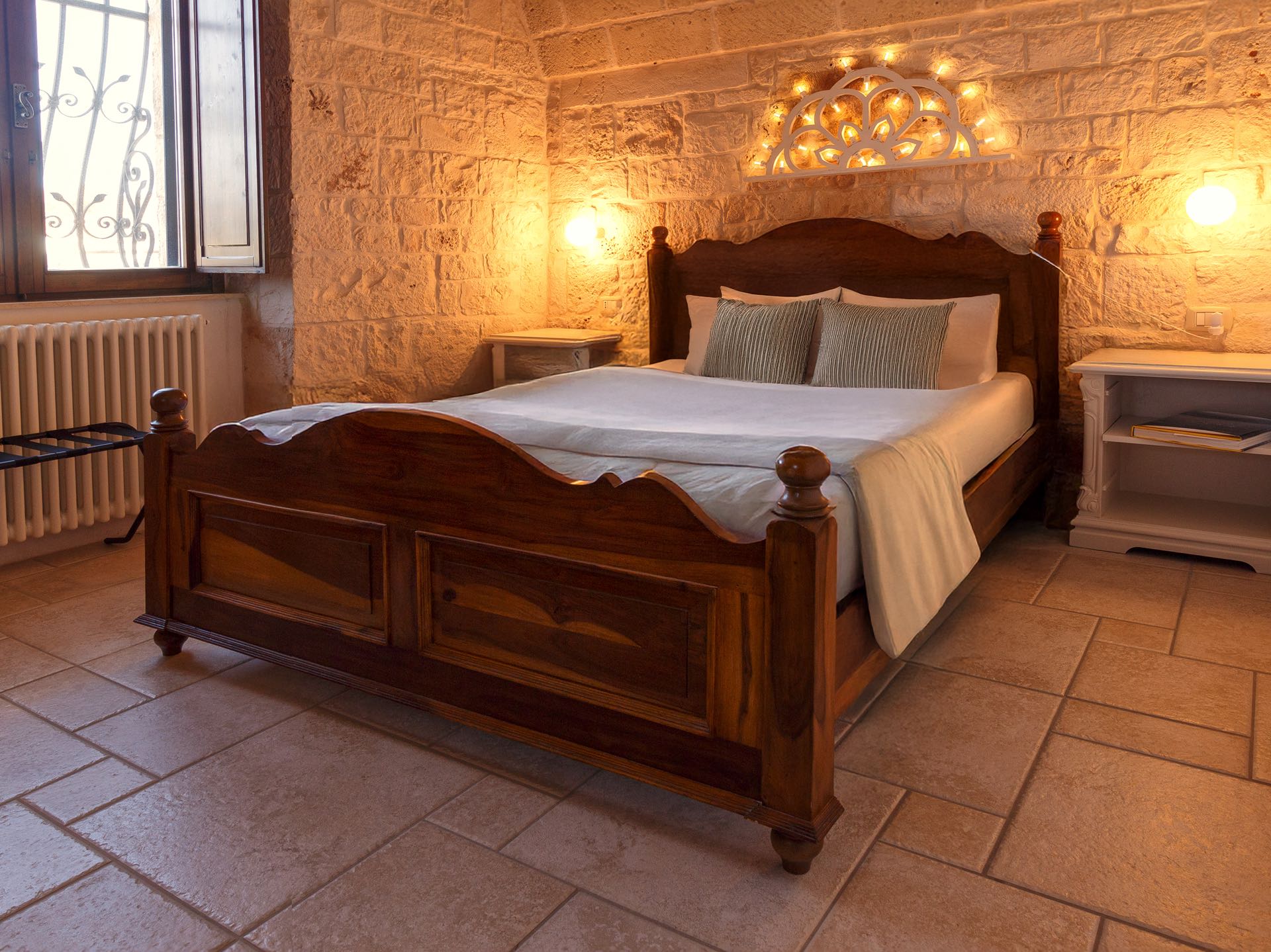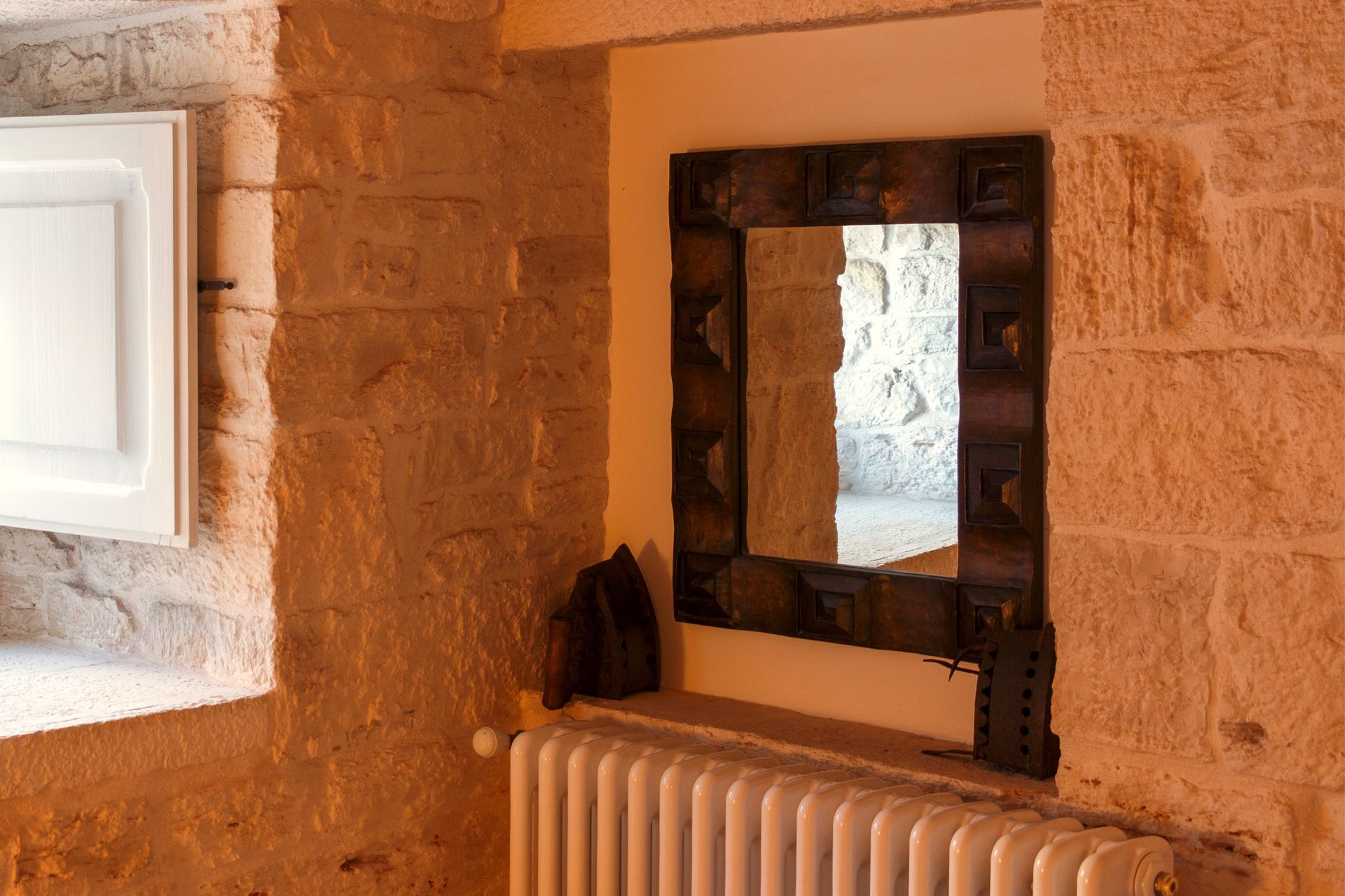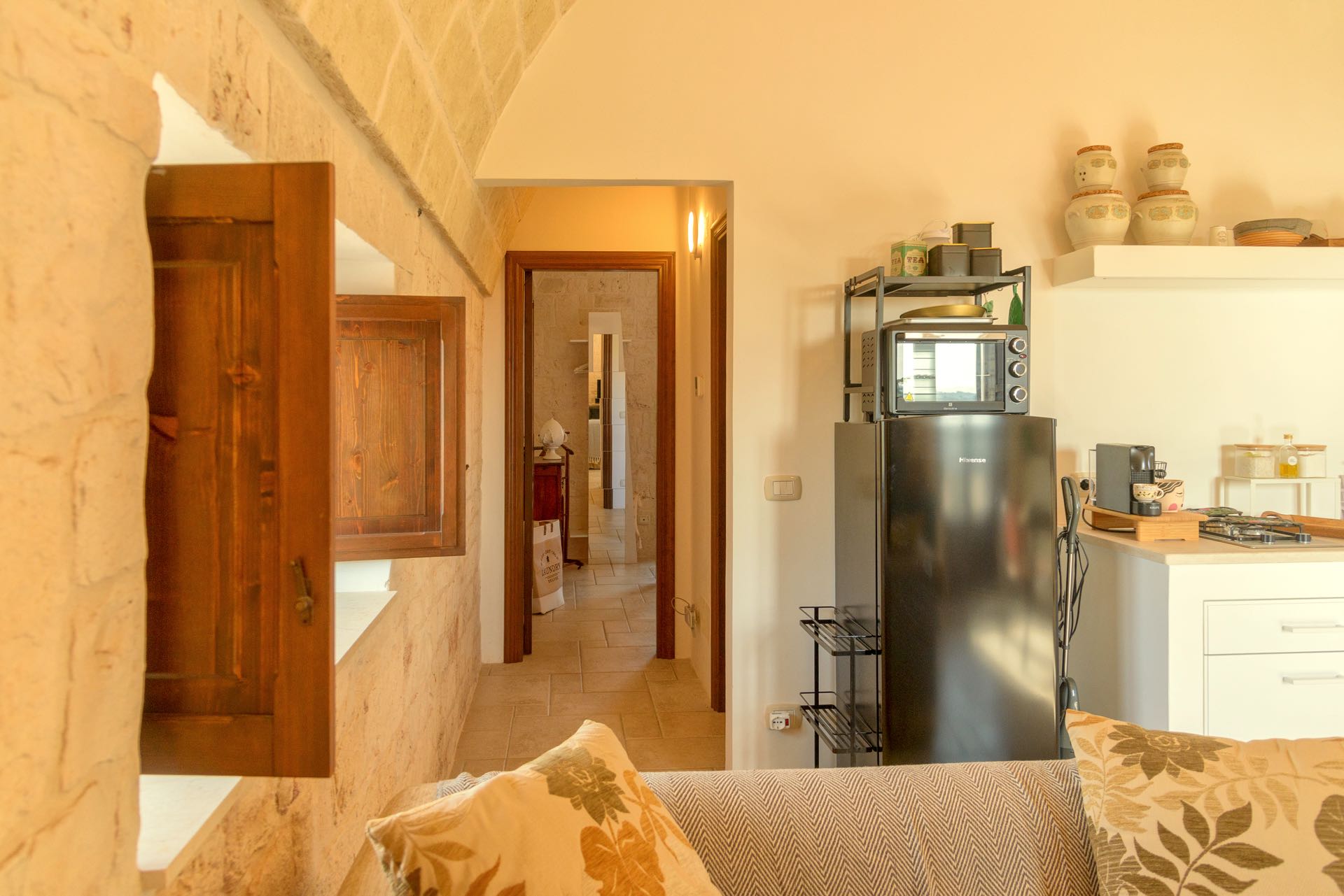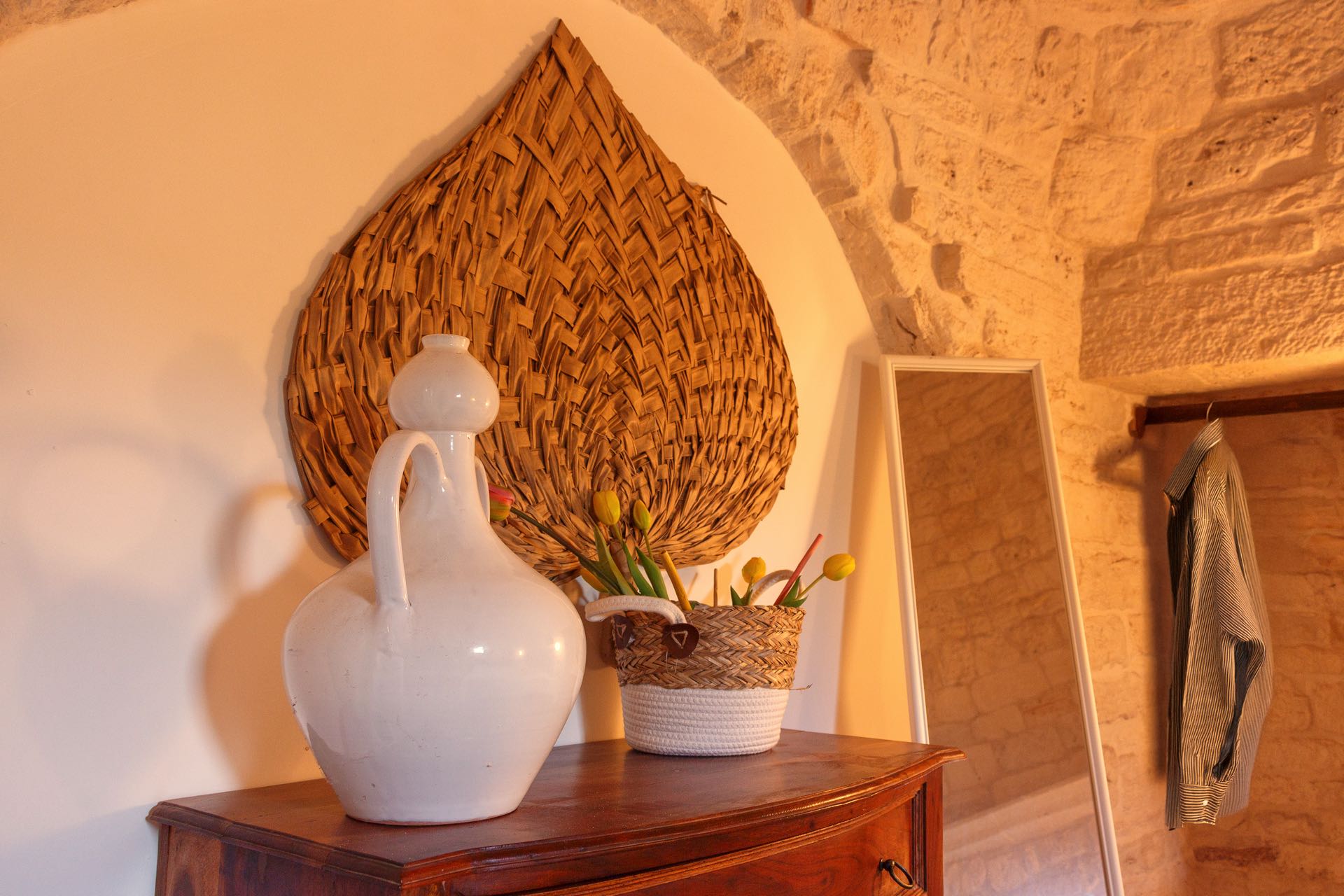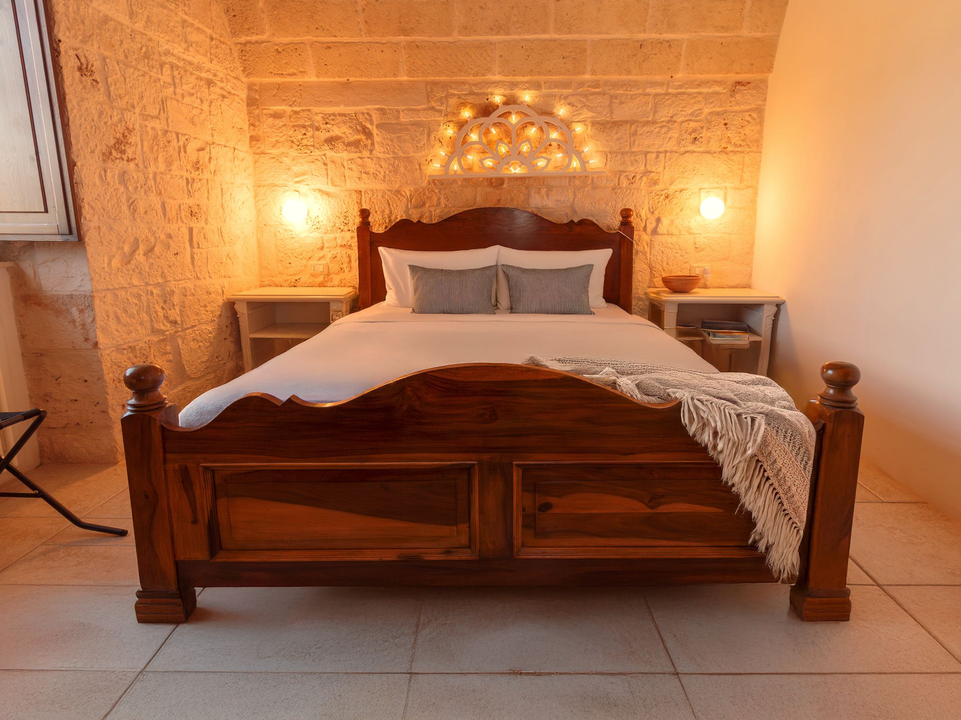 La sensazione di tornare indietro nel tempo grazie ad oggetti della tradizione e l’accoglienza del cono pugliese con luci soffuse nelle nicchie, rendono questa dimora un luogo unico. Eleganti soffitti con volte a botte, archi, nicchie e pietra originale dalle meravigliose sfumature di bianco e rosa.