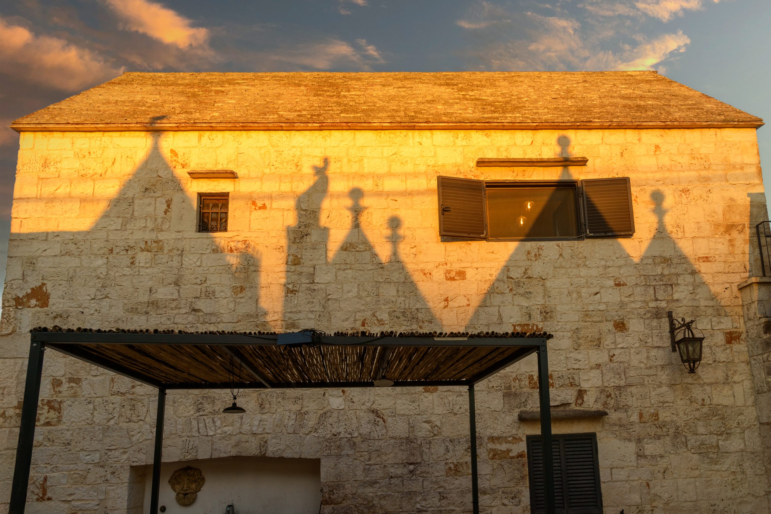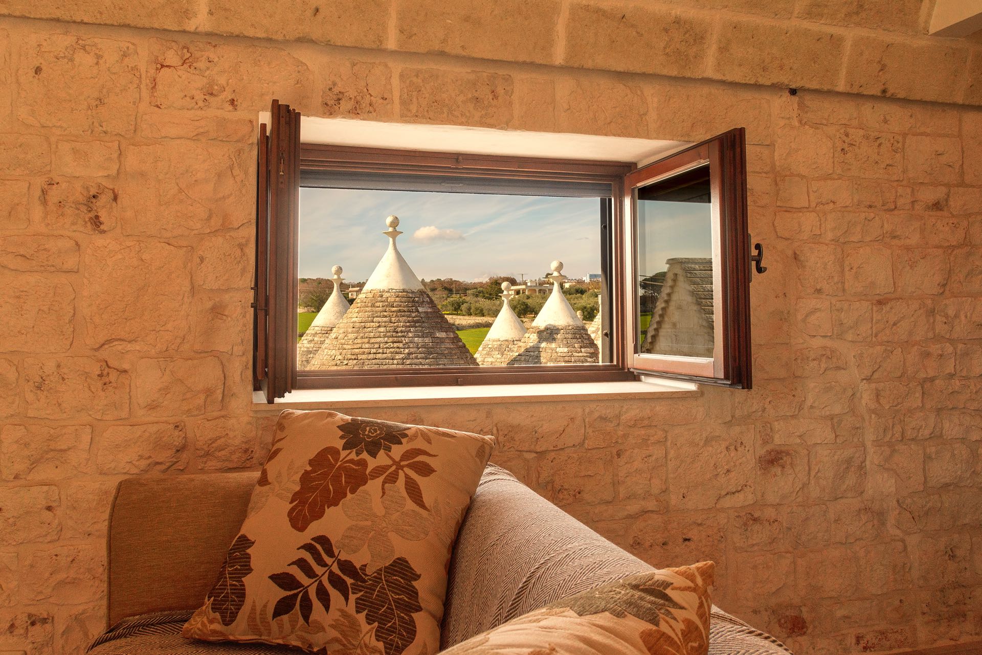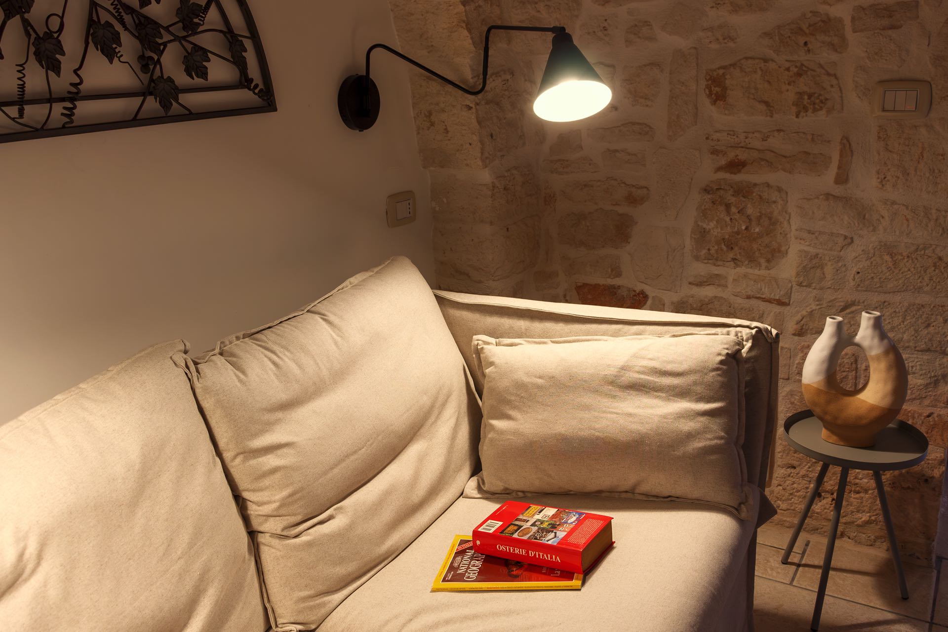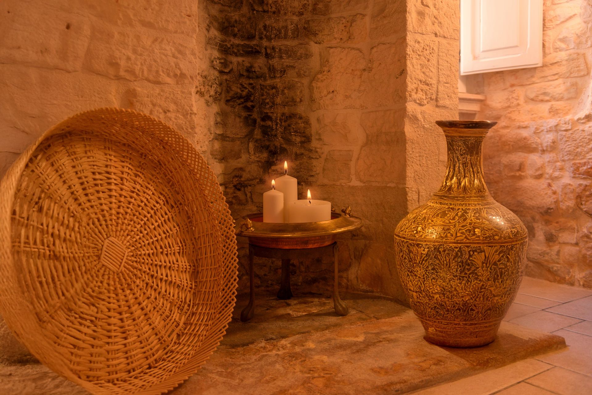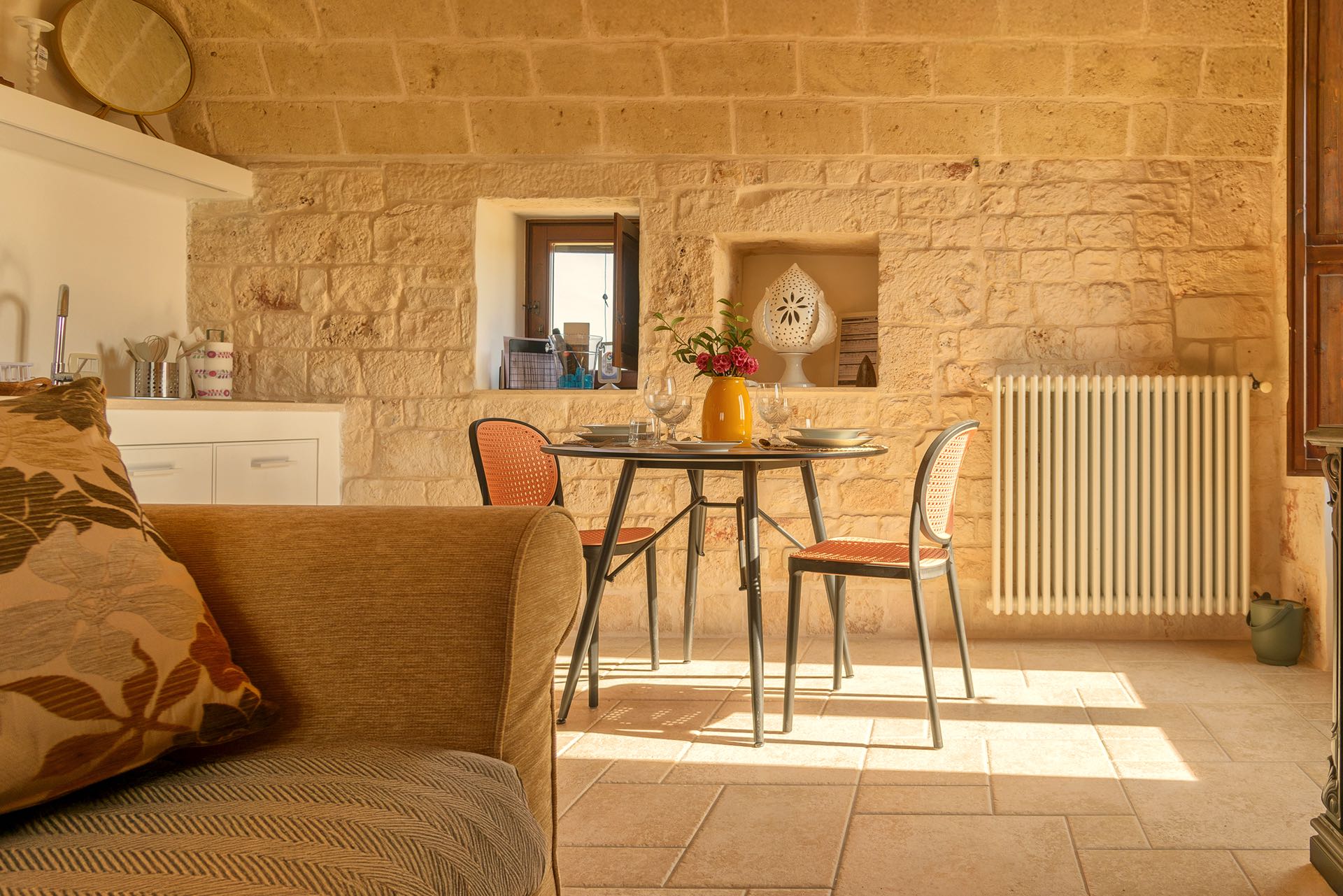 La sensazione di tornare indietro nel tempo grazie ad oggetti della tradizione e l’accoglienza del cono pugliese con luci soffuse nelle nicchie, rendono questa dimora un luogo unico. Eleganti soffitti con volte a botte, archi, nicchie e pietra originale dalle meravigliose sfumature di bianco e rosa.
