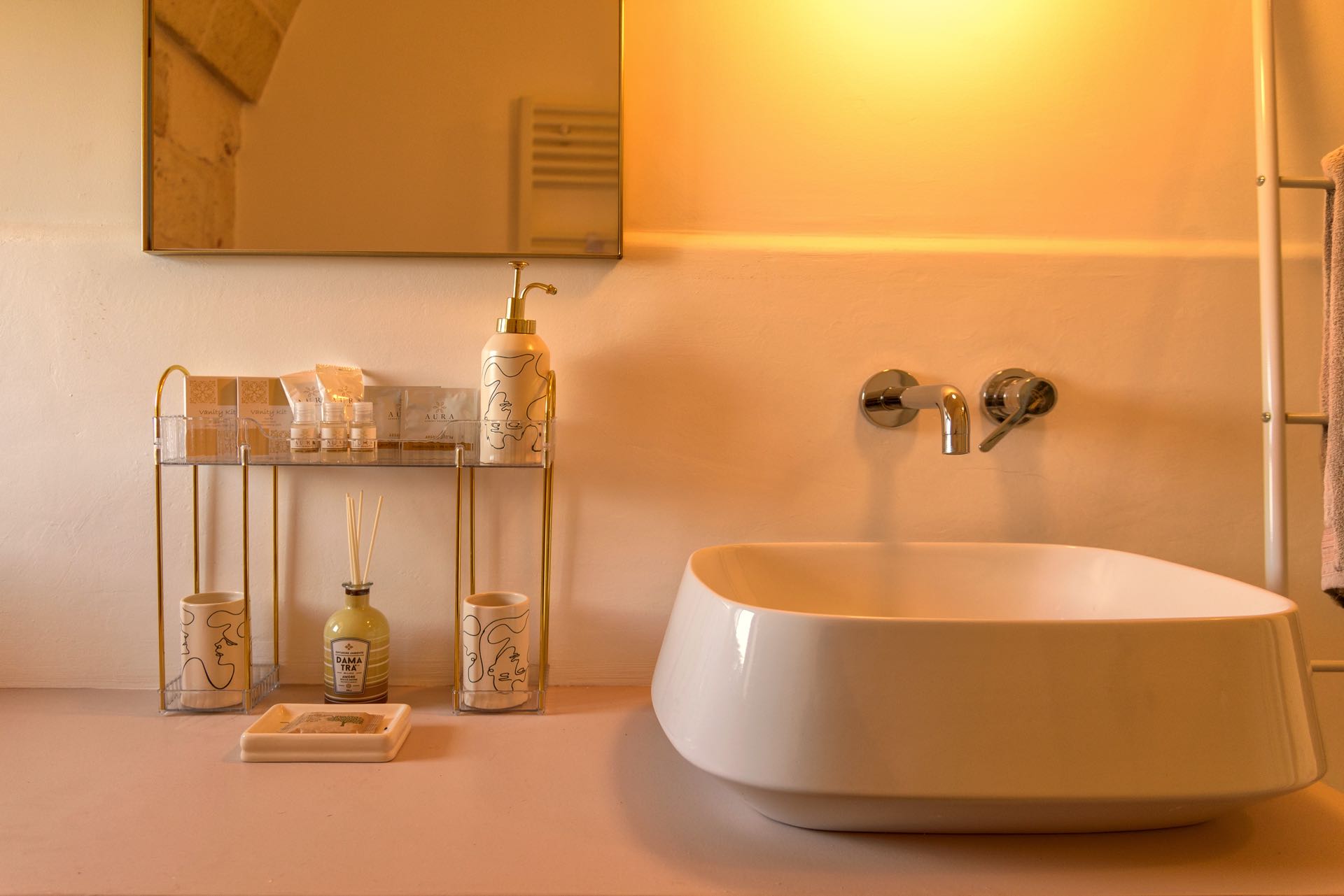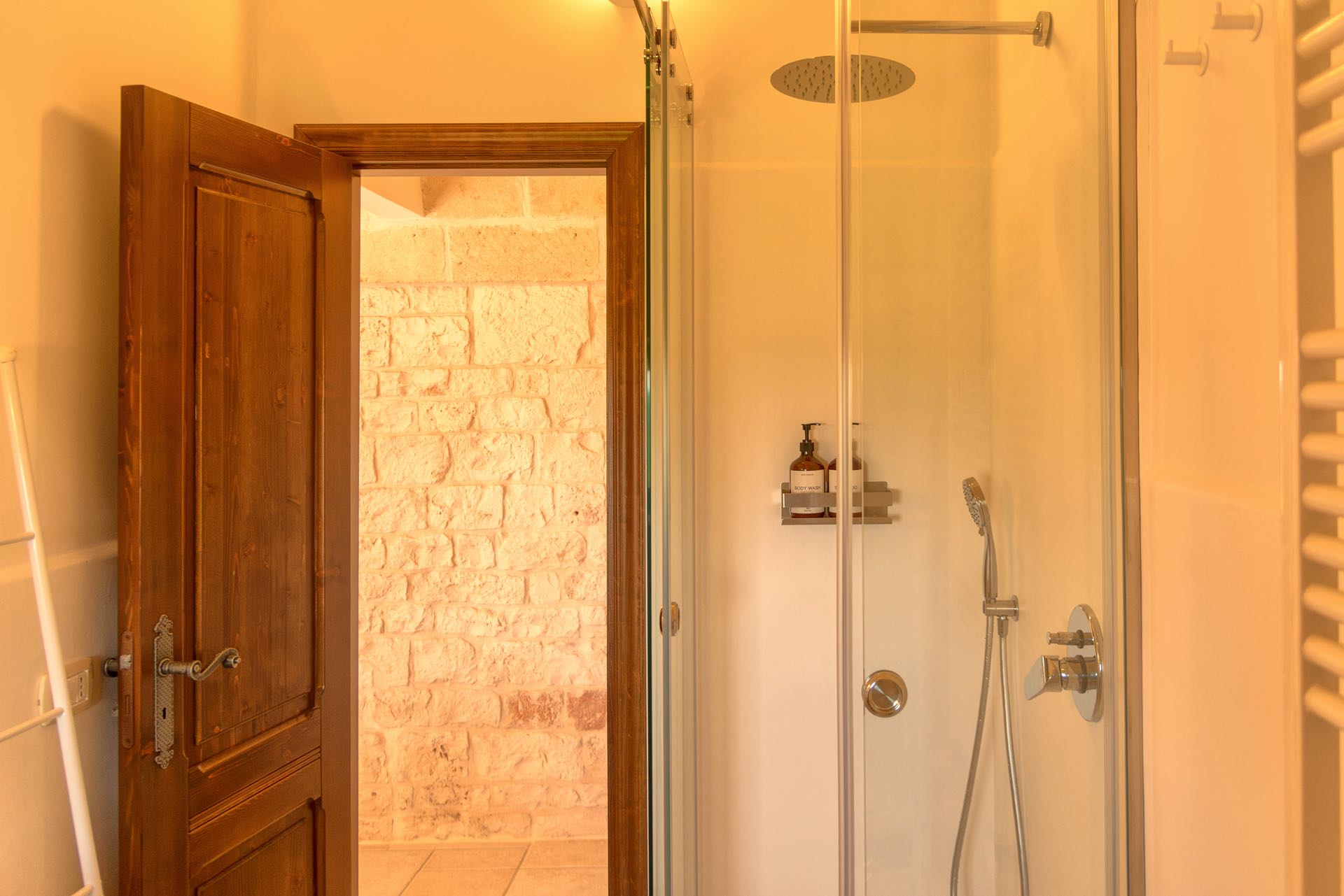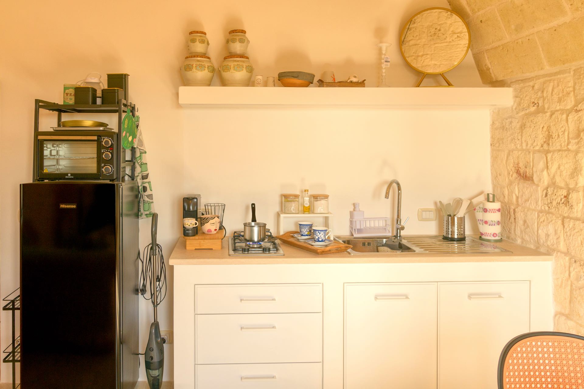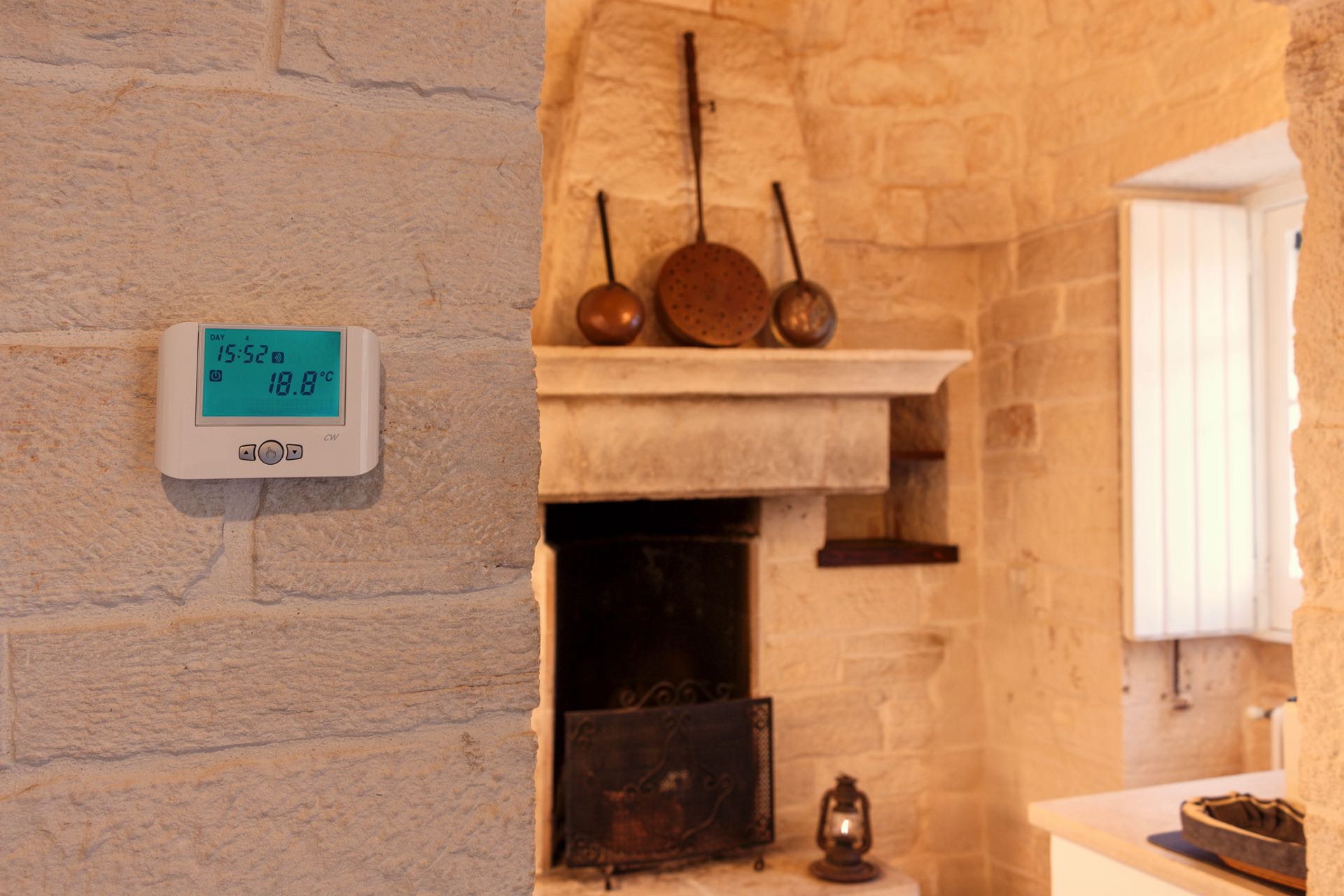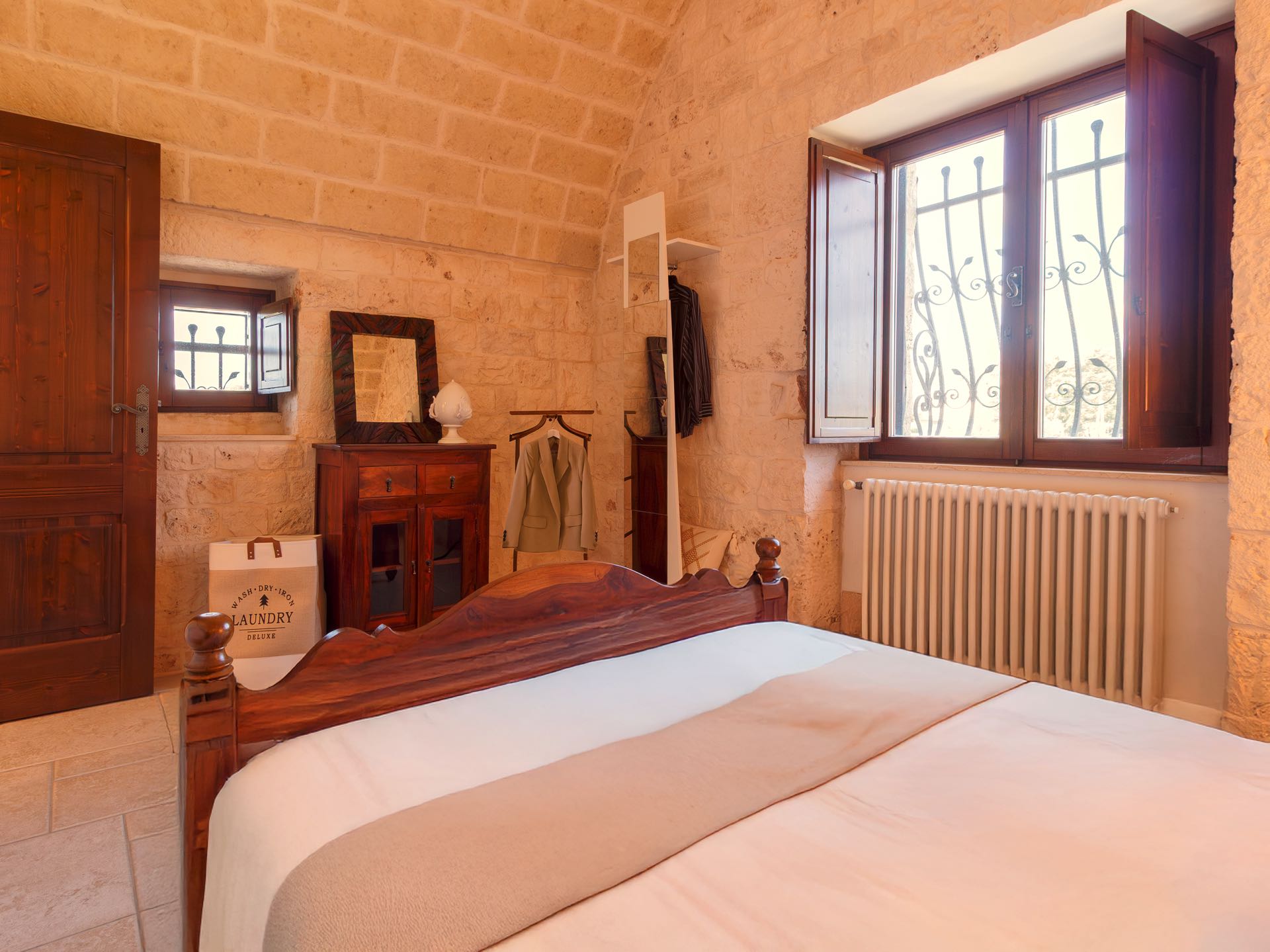 La sensazione di tornare indietro nel tempo grazie ad oggetti della tradizione e l’accoglienza del cono pugliese con luci soffuse nelle nicchie, rendono questa dimora un luogo unico. Eleganti soffitti con volte a botte, archi, nicchie e pietra originale dalle meravigliose sfumature di bianco e rosa.