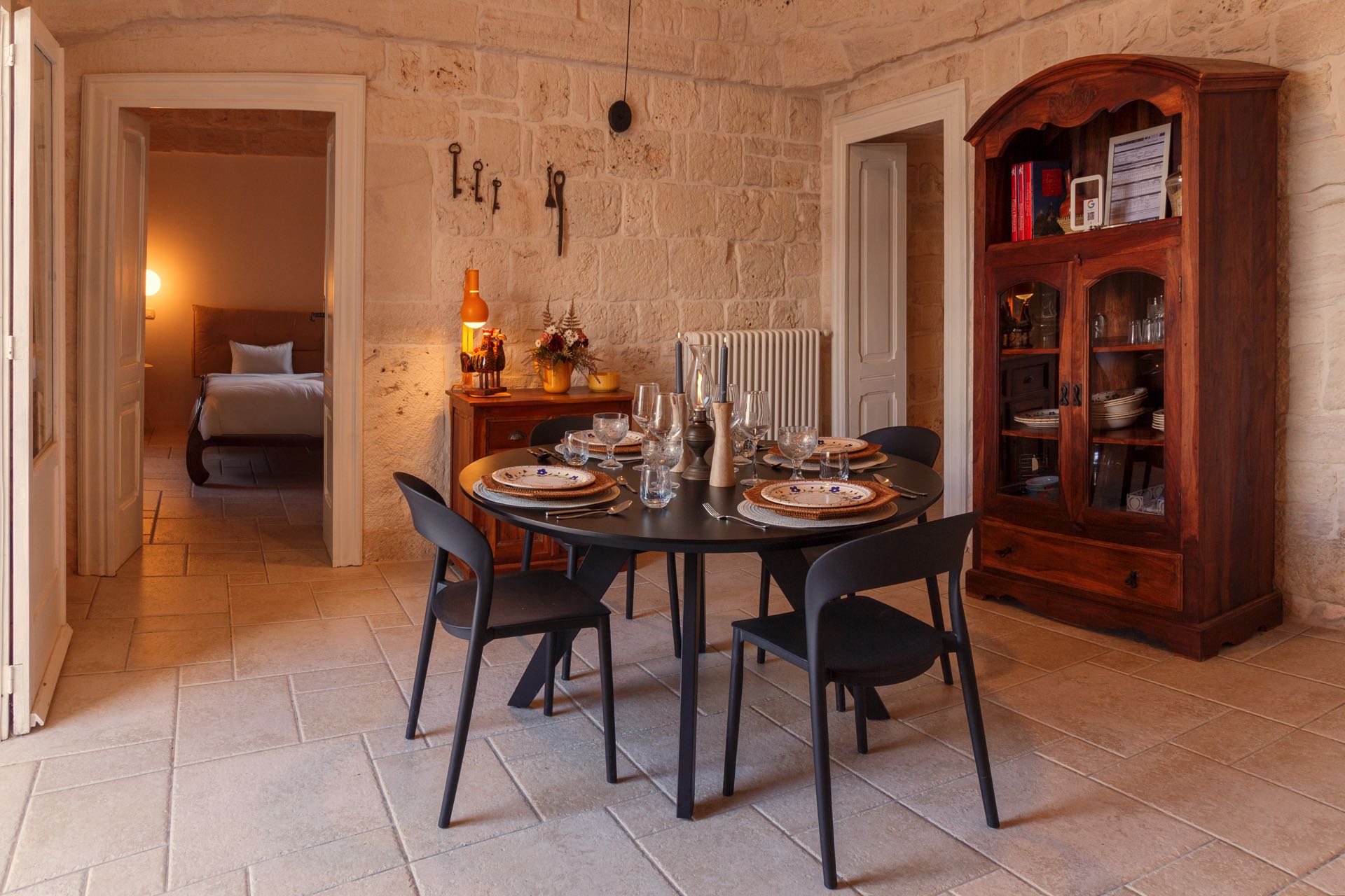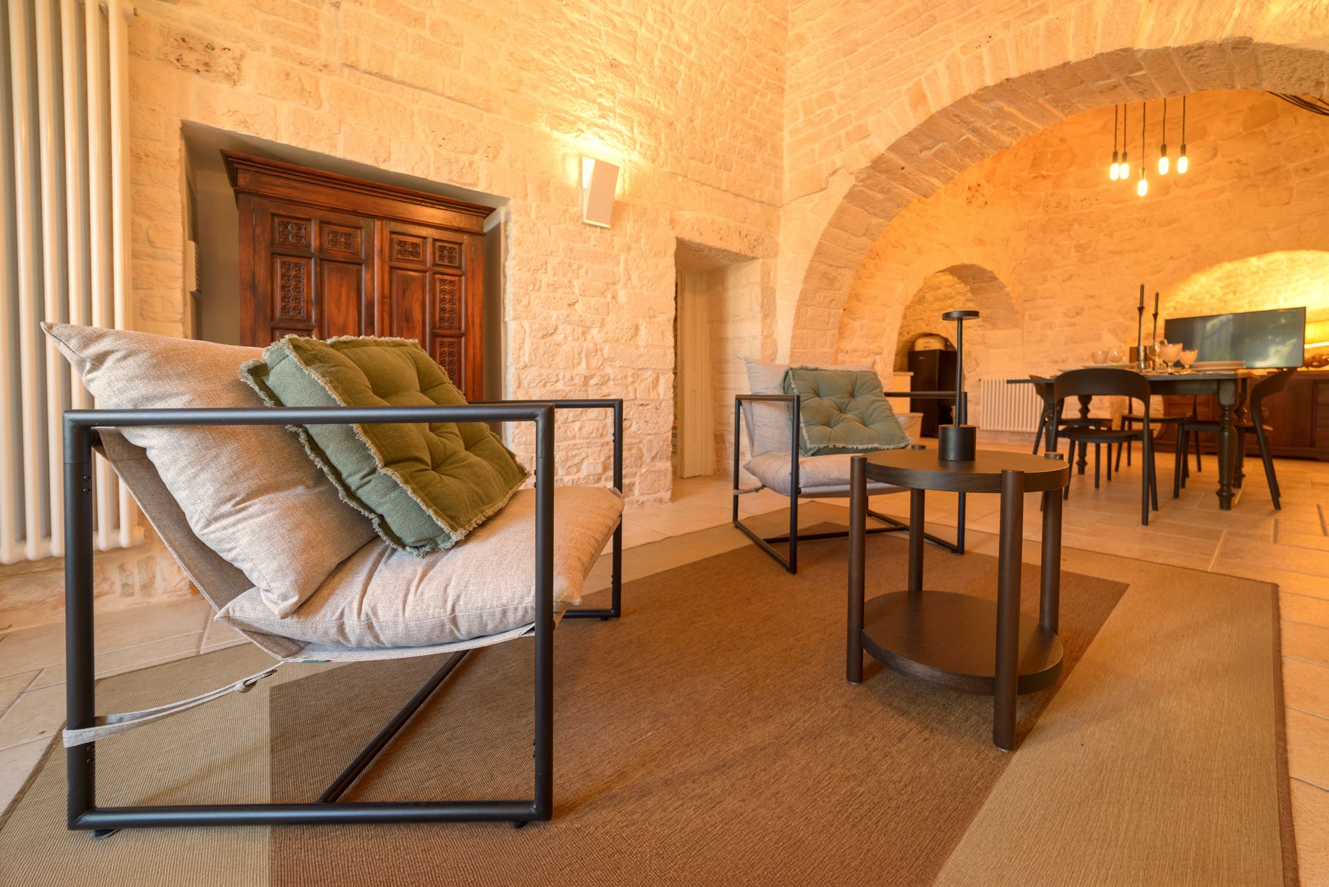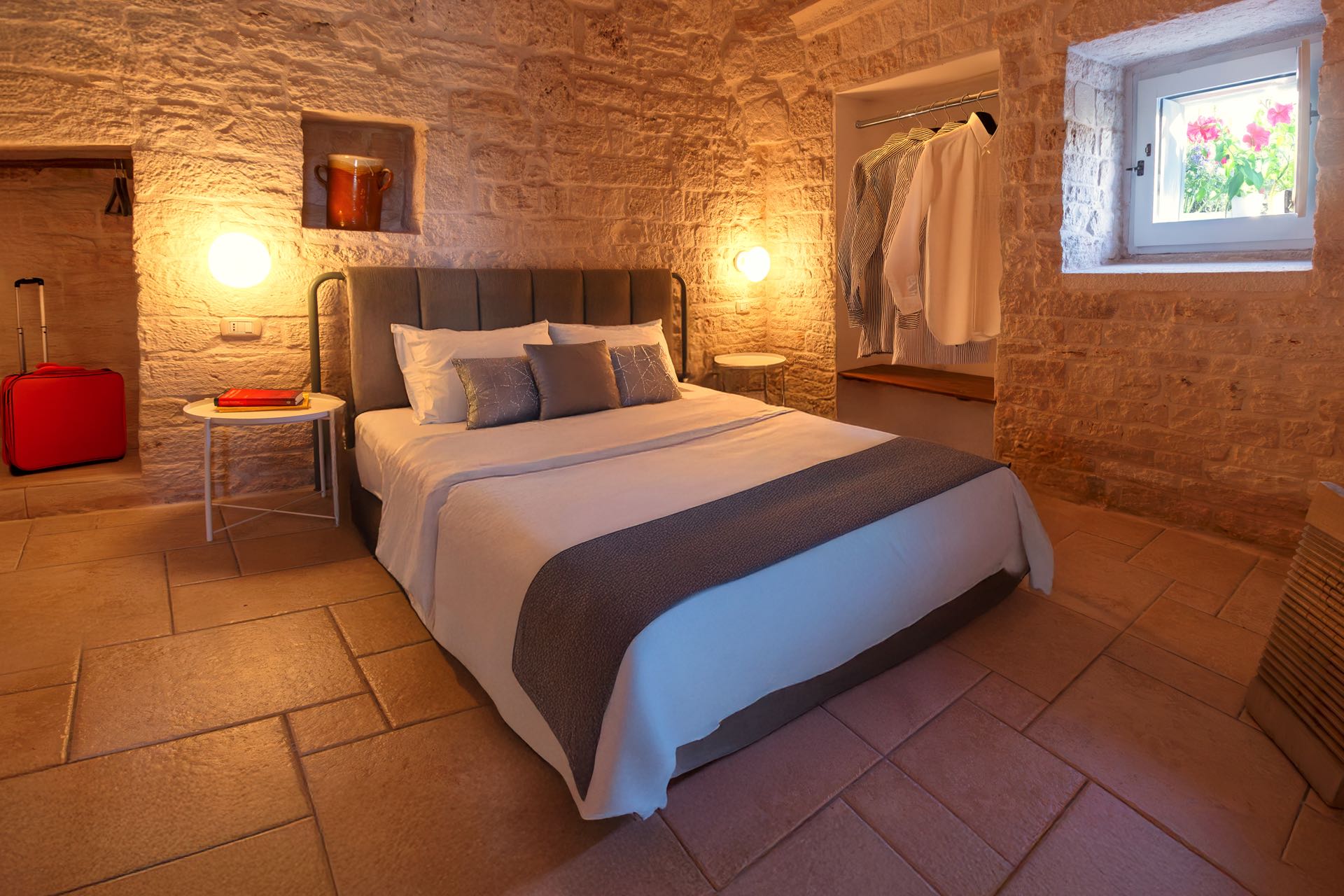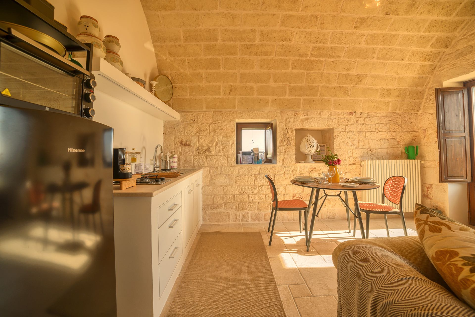Nonostante lo stile rustico delle pietre a secco, l’ambiente è intimo e di charme arredato con gusto ed eleganza.