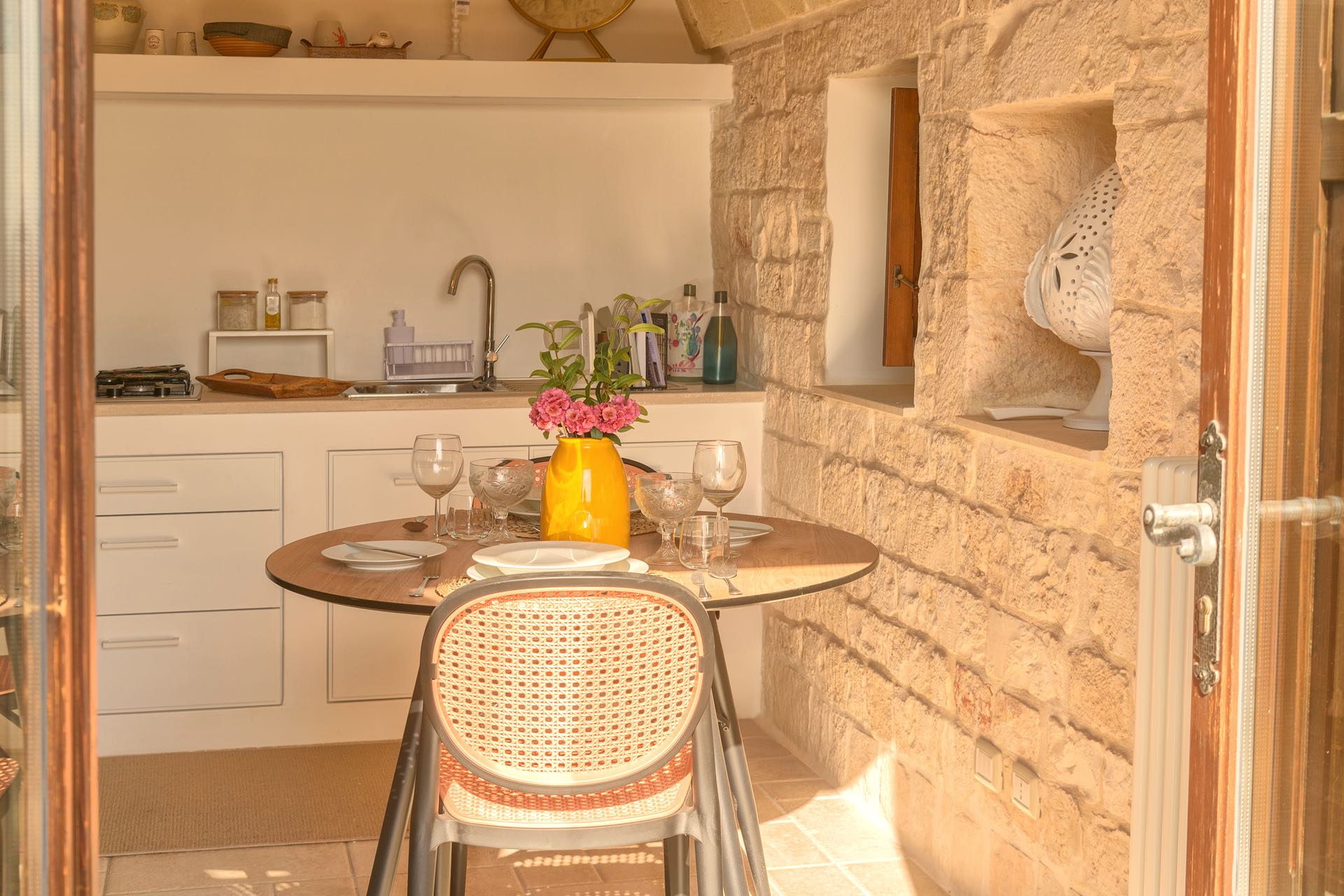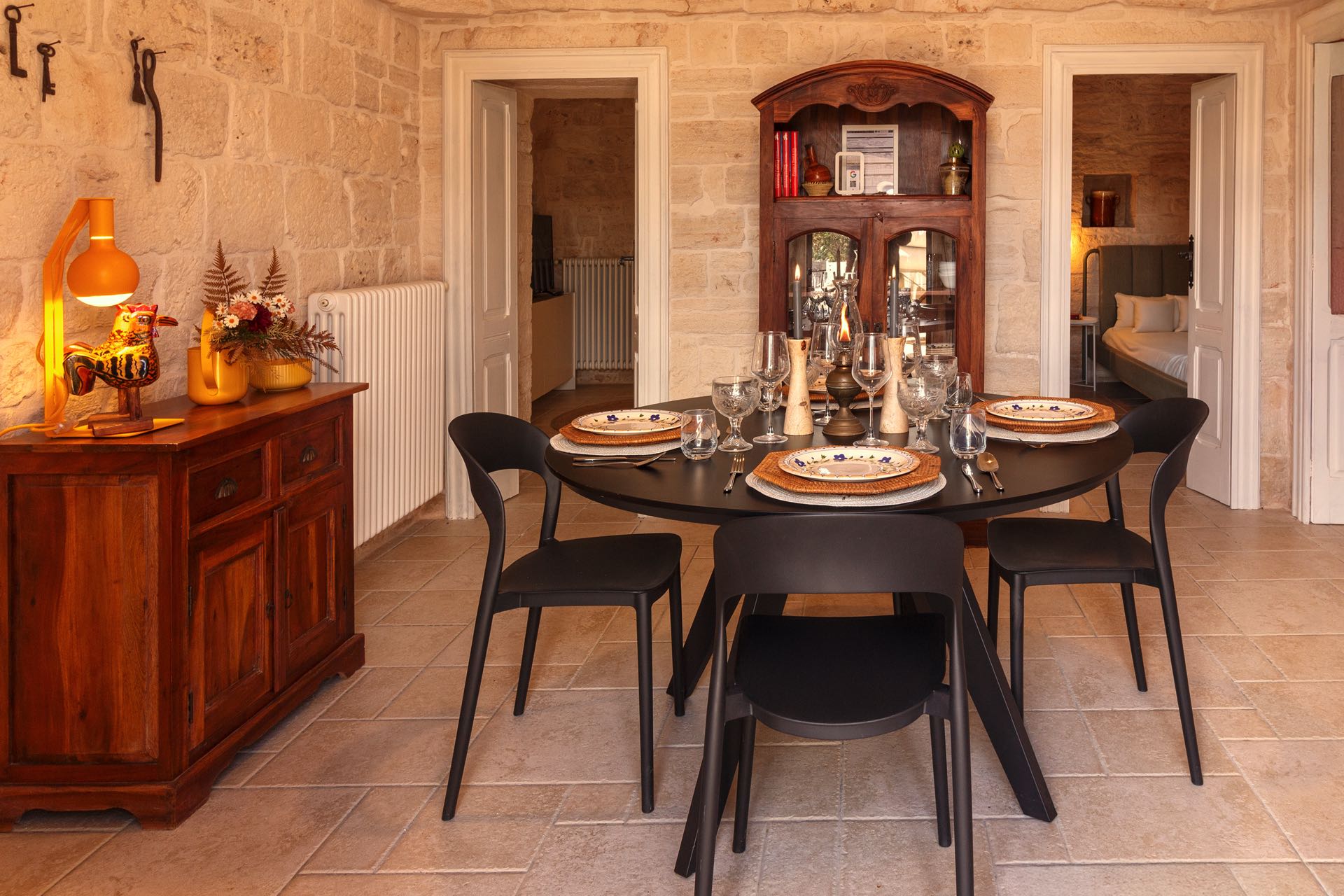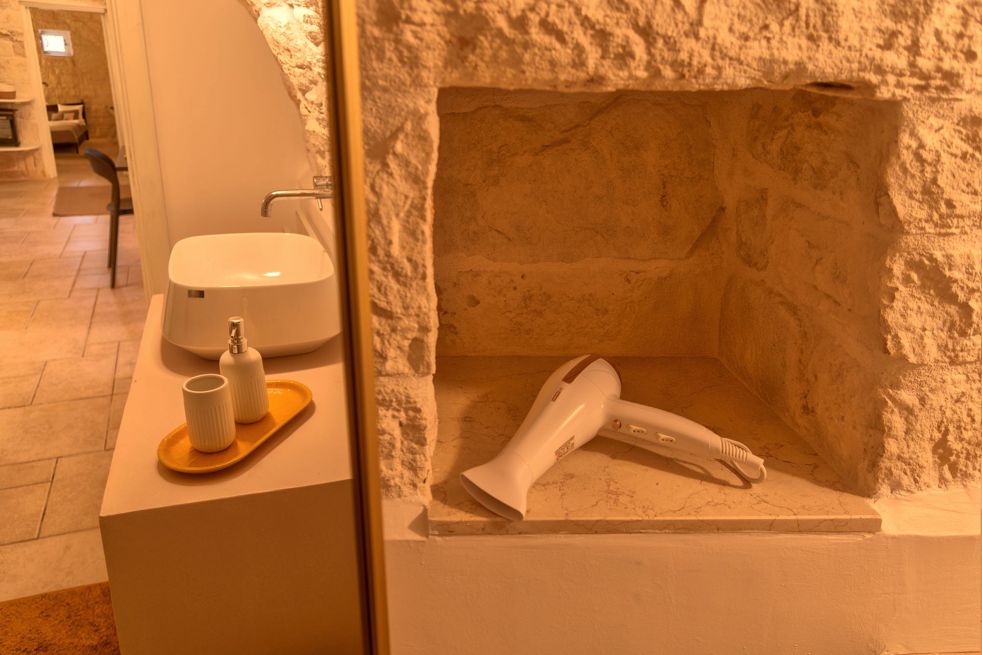 Nonostante lo stile rustico delle pietre a secco, l’ambiente è intimo e di charme arredato con gusto ed eleganza.